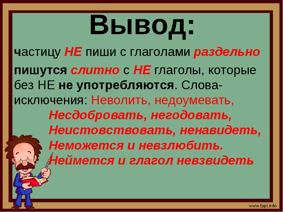 Есть еще одно условие, которое усиливает глагольную природу причастий, – это роль причастий в предложении. Какую основную роль в предложении выполняет глагол? Роль сказуемого. Какие причастия бывают в предложении сказуемыми и не могут выполнять роль определения? Краткие страдательные причастия. Они ближе к глаголам, чем к прилагательным. Как же нужно писать частицу НЕ с краткими страдательными причастиями в роли сказуемого? Только раздельно.
