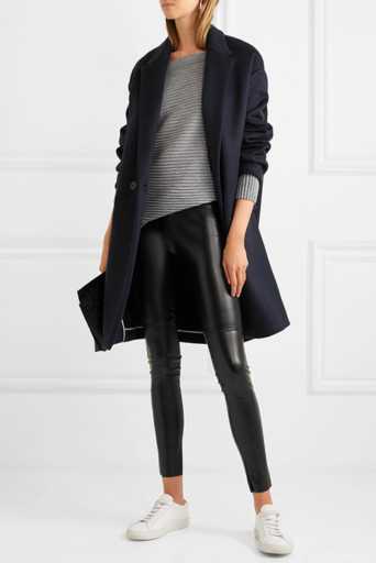 Отличным решением будет сочетание брюк из кожи и кроссовок. Если штаны черные, синие или серые обувь может быть яркой, украшенной элементами декора, например, вставками из кожи рептилий.