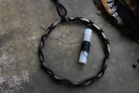 - Первым делом, связываем ветку таким образом, чтобы образовалось кольцо. Лучше всего для таких целей подходят ветви ивы. Затем, обматываем кольцо нитью или плотным шнуром, как показано на фото: