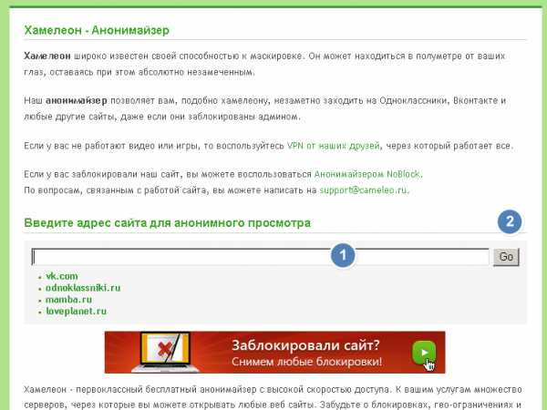 Сайт-анонимайзер позволяет обойти ограничения системного администратора и получить доступ к необходимым сайтам. Одним из таких анонимайзеров является Cameleo.ru. Пользование данным сервисом абсолютно бесплатное.