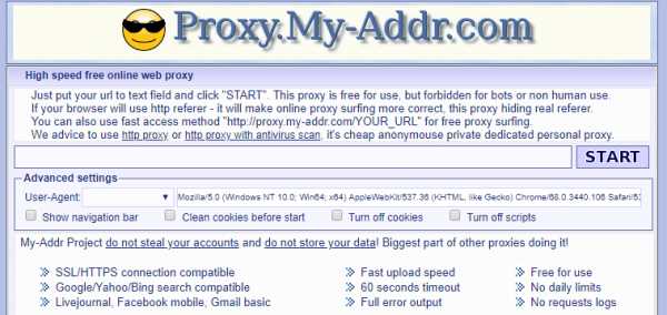 My-Addr Project – это онлайн-прокси-сервер, который не сохраняет какой-либо контент и данные, он просто передает данные с запрашиваемого сайта клиенту. Есть возможность выбрать User-Agent, выключить Cookies и скрипты. Совместим с SSL, быстр, без лимитов.