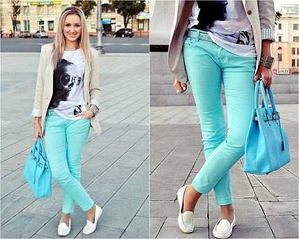 Излюбленные всеми джинсы разнообразных цветов и оттенков прекрасно впишутся в такой образ. Наверх можно надеть футболку или тунику свободного кроя. Если выбранные джинсы будут синего, песочного или другого контрастного цвета, то кофту лучше подобрать в тон обуви. Такая маленькая хитрость добавить образу органичности и сбалансированности. А вот если брюки представлены в белой палитре, то футболочку можно выбрать любого другого цвета.