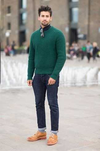 Зеленая рубашка с длинным рукавомСерый вязаный свитер и черные джинсы будут гармонично смотреться в стильном гардеробе самых требовательных молодых людей.