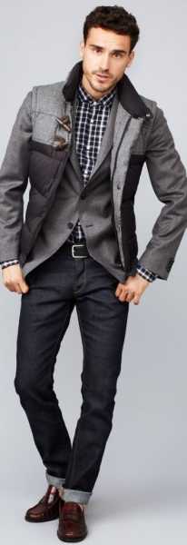 Темно-красный хлопковый шарф в шотландскую клеткуТемно-коричневый пиджак с узором «в ёлочку» и черные джинсы однозначно украсят гардероб любого джентльмена.