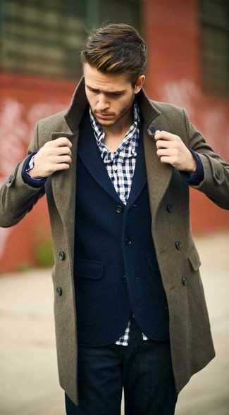 Бело-синяя классическая рубашка в мелкую клеткуОливковый пиджак в паре с черными джинсами прекрасно вписывается в разные дресс-коды.