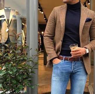 Коричневый шерстяной пиджакСочетание коричневого шерстяного пиджака и черных джинсов придется к месту и на работе, и на прогулке с возлюбленной.