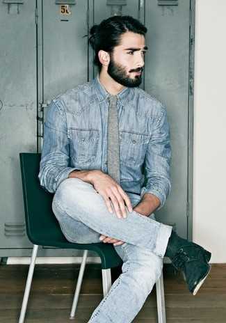 Черные замшевые повседневные ботинкиАнсамбль из синей джинсовой рубашки и голубых джинсов позволит воплотить в твоем луке городской стиль современного парня. Хотел бы сделать образ немного строже? Тогда в качестве дополнения к этому луку, обрати внимание на черные замшевые повседневные ботинки.
