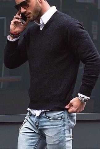 Голубые джинсыЧерный свитер с v-образным вырезом и голубые джинсы позволят составить нескучный и модный лук.