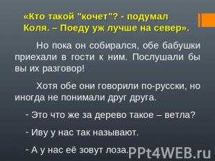 а) Вы идете по глухому лесу вдоль реки, которая впадает в Белое море. Вдруг из-за глухой елки дедка дружелюбно кричит вам: « Эй, друг! Туда не ходи, там – няша.» http://nsportal.ru/shkola/russkiy-yazyk/library/2015/10/05/razrabotka-uroka-russkogo-yazyka-dialektnye-slova-v-6-klasse