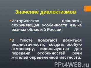 Диалектные слова не входят в состав литературного языка, так с какой же целью они употребляются в художественной речи? (Для передачи особенностей речи жителей определённой местности.)
