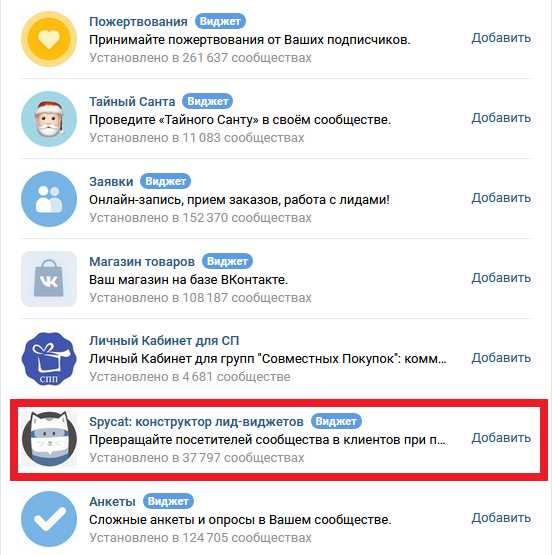 В каталоге одобренных приложений найти виджет для сообщества и нажать кнопку «Добавить».