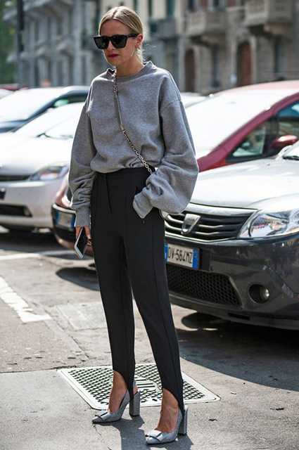 Насчет остальных элементов образа… На самом деле комбинировать брюки со штрипками не сложнее, чем любые другие легинсы, джинсы или штаны. В зависимости от фактуры ткани и кроя вы можете надеть их с жакетом, блузкой и даже бомбером.