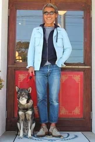 Голубая джинсовая куртка и синие джинсы — беспроигрышный образ, если ты хочешь создать простой, но в то же время модный мужской лук. Пара серых ботинок дезертов из плотной ткани идеально гармонирует с остальными элементами ансамбля. Такое сочетание вещей гарантирует, что твой осенний лук не будет обыденным.