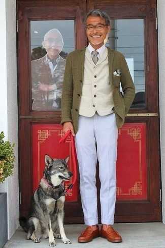 Для создания элегантного мужского вечернего образа идеально подойдет оливковый шерстяной жилет и серые шерстяные классические брюки. Любишь незаурядные решения? Можешь завершить свой лук оливковыми ботинками дезертами из плотной ткани. Такой ансамбль будет приятно примерить на себя в хмурый осенний день.