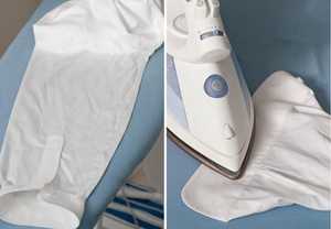 - Значительно облегчить процесс глажки рукавов поможет специальная надставка или обычное свернутое в рулон полотенце, засунутое в рукав.