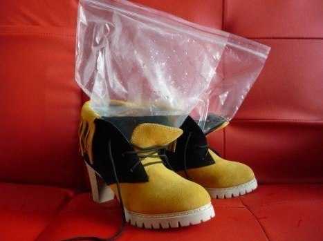 Суть способа в том, что в обувь кладут хорошо закрытый полиэтиленовый пакет, заполненный водой почти на треть. Нужно равномерно уложить его от пятки до носочка, после чего поместить в морозильную камеру на несколько часов, лучше на ночь.
