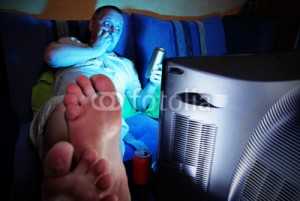 Мужчина, который сидит перед телевизором и прокручивает на большом
