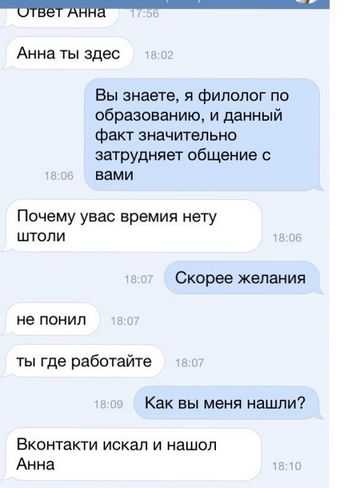 Как начать общение с девушкой В контакте? – никак. Инициативу оставь за ней. Кинь ей интригующее сообщение, а-ля: «я о тебе слышал…» или «ты меня удивила…». Это не самые лучшие примеры, учти. Цель одна – натолкнуть на гарантированный отклик, как правило, вопросительного характера: «Почему? Зачем? Чем? Когда?», ты понял. Выжди с ответом хотя бы сутки, она должна понервничать. Минимум часов шесть – восемь. Как понравиться девушке Вконтакте, когда ты навязываешь ей свое общение, словно пацан – никак.
