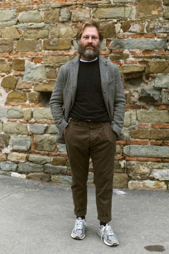 Самый безопасный вариант сочетания кроссовок с пиджаком — выбрать последний такого стиля, чтобы его спортивность не вызывала никаких сомнений: фактурный, с накладными карманами, возможно, с заплатками или вообще приближенный к рабочему стилю. Тогда, надев к нему спортивную обувь, вам не о чем будет беспокоиться.