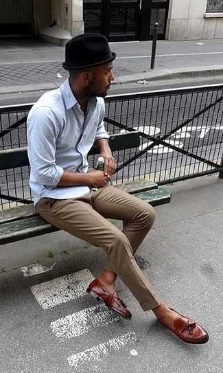 Сочетание рубашки с длинным рукавом и мужские коричневые классические брюки от Asos поможет воссоздать элегантный мужской стиль. Отлично здесь смотрятся кожаные лоферы с кисточками.
