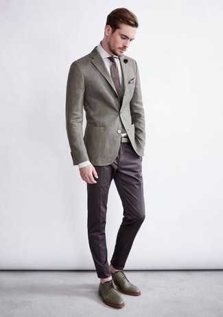 Сочетание шерстяного пиджака и коричневые шерстяные классические брюки смотрится очень эффектно и элегантно. Думаешь привнести в этот лук толику строгости? Тогда в качестве дополнения к этому ансамблю, выбери темно-коричневые кожаные туфли.
