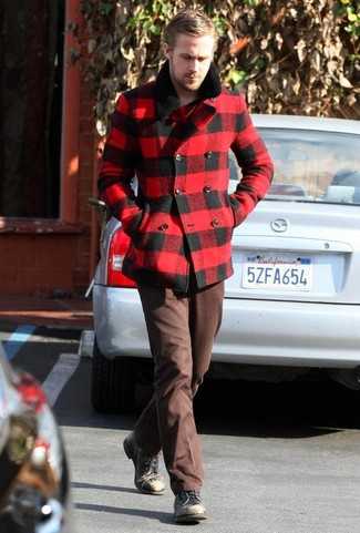 Красно-черное полупальто в мелкую клеткуЛюбой мужчина будет выглядеть выше всяких похвал в красно-черном полупальто в мелкую клетку и темно-коричневых классических брюках. Не прочь поэкспериментировать? Тогда заверши образ черными кожаными повседневными ботинками.