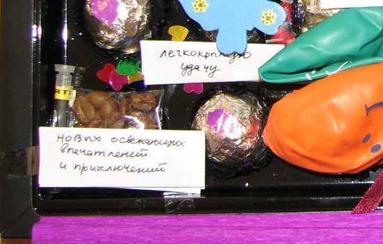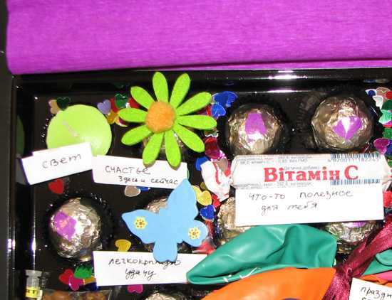 Внутрь положите всякие милые мелочи, связанные с вашими общими воспоминаниями. Совместные фотографии, брелок, привезенный из общей поездки, засушенный цветок, флакон с ее любимым ароматом, несколько лаков для ногтей и т. д. Пусть эта небольшая коробочка станет вместилищем приятных впечатлений и хорошего настроения. Дополнительно в нее можно положить любимые конфеты именинницы, маленькие леденцы или шоколадки.