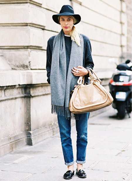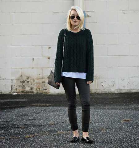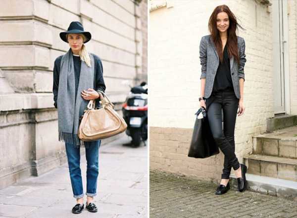 Во все времена актуальным и стильным образом считался наряд на основе джинсов-скинни, блузки, жакета и лоферов на каблуках. Когда на улице холодно, такую обувь можно комбинировать с однотонными плотными колготами с узором, длинным свитером, широким пальто и шарфиком-снудом.