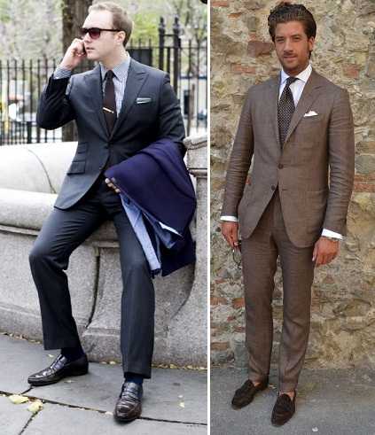 - Правильно подобранная модель мужских лоферов прекрасно смотрится с официальной одеждой – деловым костюмом, классическими брюками, рубашками и джемперами. Лучше всего к такому ансамблю подойдут пенни-лоферы, модель, которая украшена поперечной полоской в той части, что идет поверх стопы или лоферы с кисточкой и бахромой. При этом к офисному стилю идеально подойдут черные, синие или темно-коричневые туфли. Светло-коричневые под деловой костюм надевать не стоит.