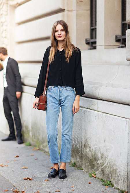 Продолжая укороченную тему, отметим, что черным лоферам по духу близки винтажные голубые джинсы и свободные черные блузки. А также коротковатые скинни (в том числе актуальные черные с прорезями на коленях) и всевозможные приталенные джемперы и водолазки. Плюс подвернутые бойфренды, кардиганы оверсайз и объемные шарфы.
