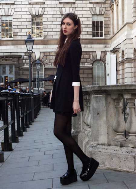 Добавить яркости образу с чёрными лоферами можно с помощью ярких носков, чулок, колготок. Такой дуэт будет смотреться оригинально и смело.