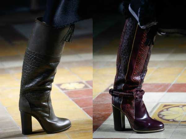 На показах также были представлены ботинки с конусовидным и прямым высоким каблуком, обязательным элементом которых являлась платформа. Для таких моделей модельеры использовали натуральные замшу и кожу благородных оттенков. В качестве элементов отделки использовалась фронтальная шнуровка или пряжки, а также комбинация материалов.