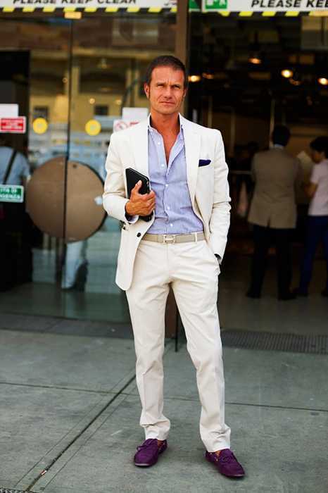 На фото ниже мы видим, как оригинально фиолетовые мокасины дополняют классический белый костюм со светлой полосатой рубашкой. Главное, не переусердствовать с красками. Если вы выбрали такой цвет, стоит выдерживать остальные вещи в одной цветовой гамме.