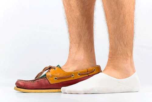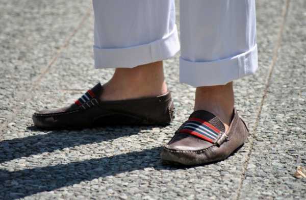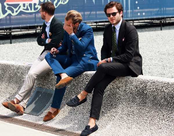 Традиционно мужские мокасины носят на голую ногу. Носки под них надевать нельзя, но если чувствуется дискомфорт, можно надеть укороченные носки, которых не будет видно под обувью, смотри на фото ниже. Если по каким-то соображениям эти носки не нравятся, то допустимо надеть простые, кроме белых и черных. Брюки в этом случае должны быть нормальной длины.