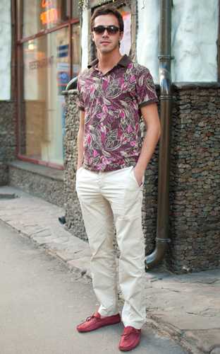 Мокасины цвета красного вина, сочетаются с брюками в коричневых тонах, темно-серыми джинсами и рубашками-поло. Коричневые и белые гармонируют с любыми джинсами и шортами, что бы сделать образ более ярким и контрастным, необходимо дополнить его яркой рубашкой или футболкой. Модели синего цвета, носят с джинсами или брюками в клетку, так же с шортами и бело-голубым верхом. Белые модели сочетаются с такого же цвета футболкой или рубашкой. Обувь черного цвета, подходит к черным брюкам и выполненному в желтом цвете верху. Зеленые мокасины, идеально смотрятся с брюками изумрудного или бирюзового цвета. Рубашка – поло, должна быть светлых оттенков.