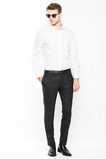 2. Классические зауженные брюки черных, серых, шоколадных цветов носите с белой рубашкой, галстуком и пиджаком из той же ткани, что и брюки.