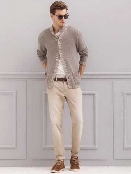 Еще один универсальный цвет брюк – бежевый, легко совмещать с пиджаками, водолазками, рубашками, свитерами. Бежевые штаны неплохо смотрятся на контрасте с темным верхом. Если брюки цвета хаки, то лучше всего надевать зеленые или белые рубашки, свитера. Дополняют такой образ джинсовая жилетка или куртка. В теплую погоду к хаки штанам подойдет светлая футболка поло.