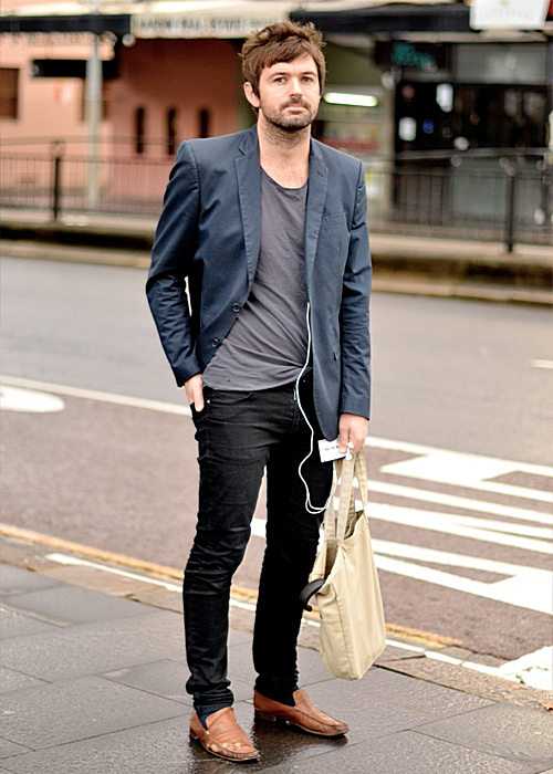 В жаркую погоду с зауженными брюками носят футболки, рубашки-поло. В прохладные дни сверху можно накинуть клубный пиджак, но для работы в офисе такая одежда не подойдет.