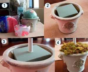 ![]() Веревка | Веревкой перевяжите в хаотичном порядке всю чашку. Это поможет закрепить спонжи, а также создаст декоративную элегантность. |
