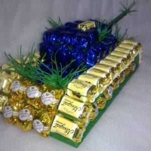- Из конфет. Такой презент обязательно порадует сладкоежку.