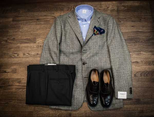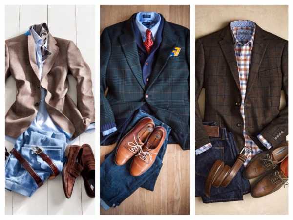 Брюки и пиджак. Здесь важно создать контраст. Это может быть контраст цветов (например, синий пиджак и серые брюки), контраст рисунков (скажем, однотонные брюки и пиджак в клетку) или же контраст фактур (например, твидовый пиджак и фланелевые брюки). Пиджак может быть как светлее брюк, так и темнее — это некритично; главное — гармония и приятное глазу сочетание.