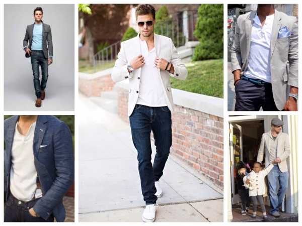 С обычным пиджаком можно носить простые однотонные футболки и поло, главное – чтобы они гармонировали в цветовой гамме. Если вы выбираете майку с принтом, пуговицы на пиджаке нельзя застегивать.