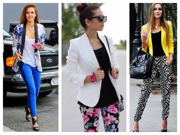 - С жестким, структурированным пиджаком отлично смотрится мягкая, облегающая блузка или рубашка с принтом или фото. Низ при этом должен быть простым повседневным.