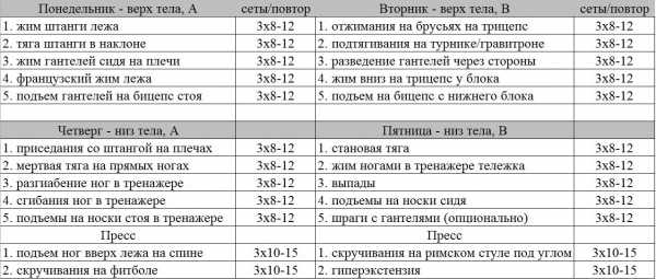Существует огромное количество программ тренировок, однако новичкам без тренера не стоит пробовать сложные варианты. Для начала лучше ограничиться последовательной проработкой всех мышц.