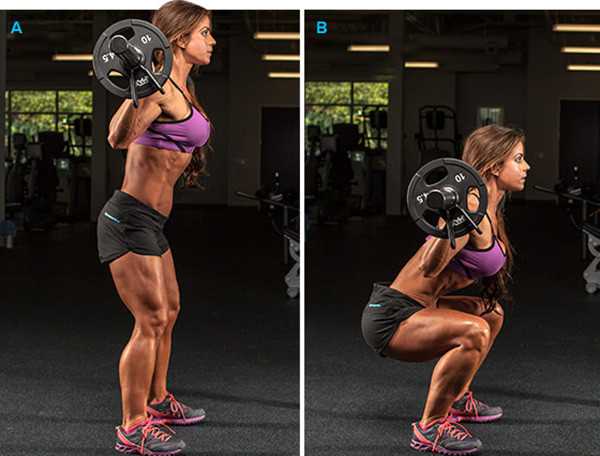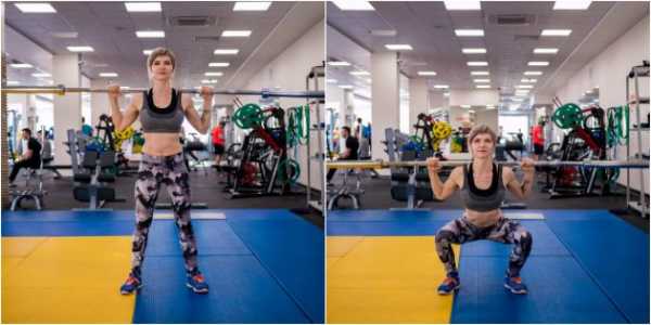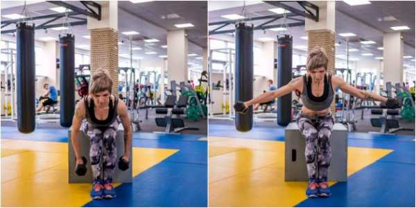 Разминка. Подготавливает тело к тренировке, разогревает мышцы, снижает риск возникновения травм при выполнении упражнений с сопротивлением. Улучшает кровообращение, и заставляет сердце работать в нужном ритме. Длительность разминки 15–20 минут. Это может быть любой кардиотренажер: беговая дорожка, велотренажер или эллиптический тренажер, а также прыжки со скакалкой. Каждая тренировка всегда должна начинаться с разминки.- Приседания на стул или лавку. Чтобы выполнить упражнение, возьмите в руки гантель весом 3–4 кг и прижмите ее к груди. Поставьте ноги немного больше ширины плеч, носки разведены в стороны на 30 градусов. Опускайтесь на позади стоящий стул или лавку, колени разведены в стороны. Спина ровная, лопатки сведены, грудь вперед. При подъеме делайте упор на пятки. Выполнять 3 повтора по 8 раз.