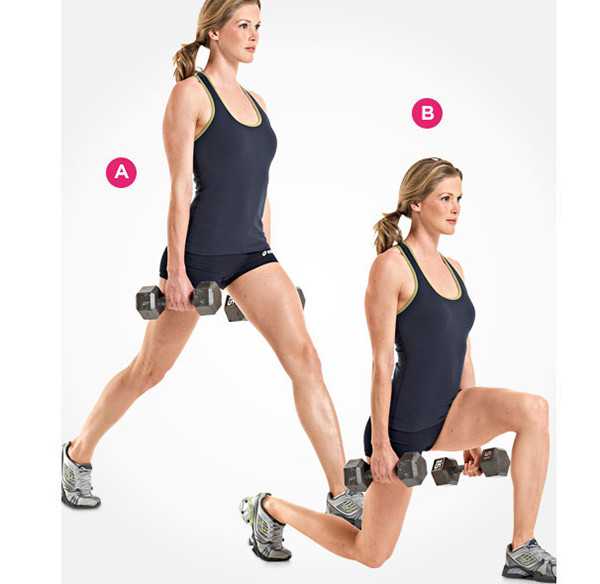 Во время выпада следите за тем, чтобы колено впереди стоящей ноги находилось ровно над пяткой. Немного наклонив корпус вперёд, вы сместите акцент на ягодицы.