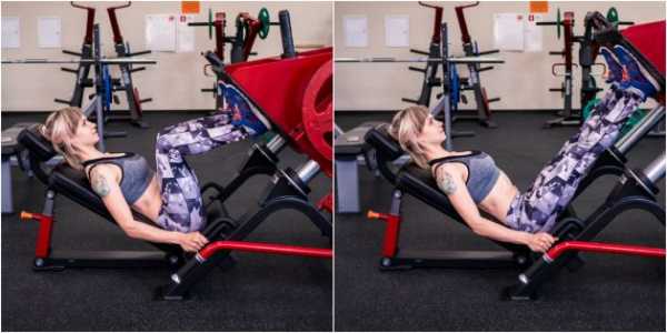 - Ноги вверху платформы — акцент на ягодичные мышцы и бицепс бедра.