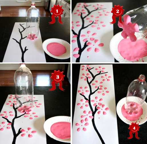 Берем розовую и коричневую малярные краски, а также белый отрезок плотной бумаги и пластиковую бутылку. Наливаем в пластиковые тарелочки розовую краску и коричневую. Кисточкой рисуем очертание ветви, затем берем пластиковую бутылку и донышком окунаем в розовую краску, затем штампуем ею на поверхности листа бумаги по краям от нарисованной веточки. Когда краска высохнет, панно с сакурой можно дарить маме.