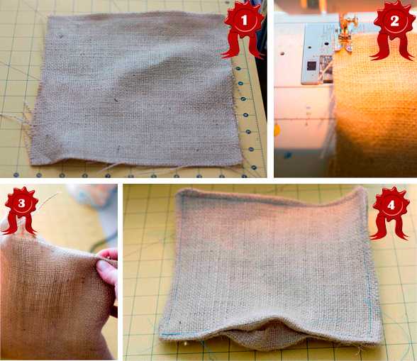 Вырезаем из мешковины или любой другой ткани два квадрата. Подгибаем их части вовнутрь и проутюживаем, затем две части сшиваем вместе, оставив отверстие для набивки. Наполняем подушку синтепоном, обвязываем ее бечевкой, по типу подарочной ленты, не забыв завязать сверху бантик.