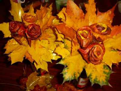 А теперь мы расскажем Вам,как можно сделать замечательный «Букет роз» из осенних кленовых листьев. Подобные поделки из природных материалов могут органично дополнить нашу вазу с «гравировкой» листа папоротника.